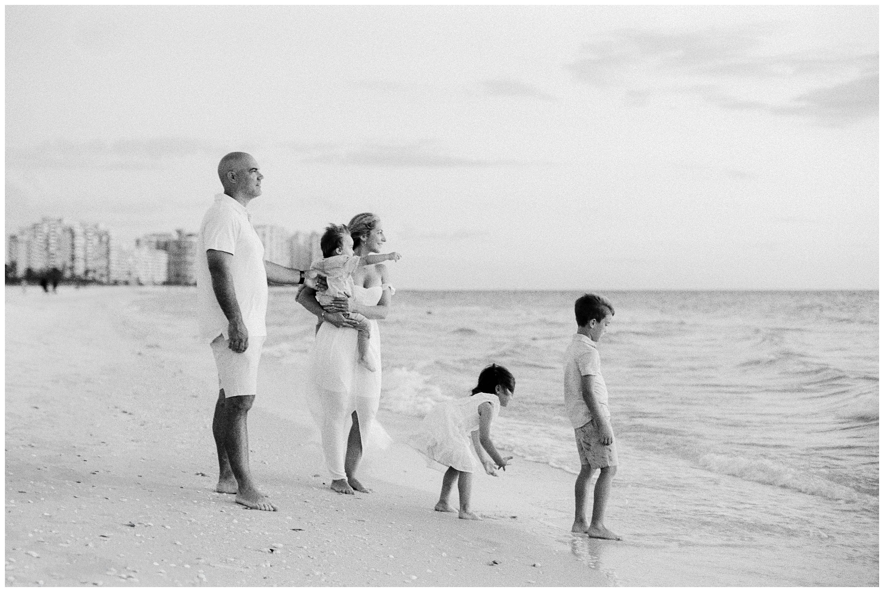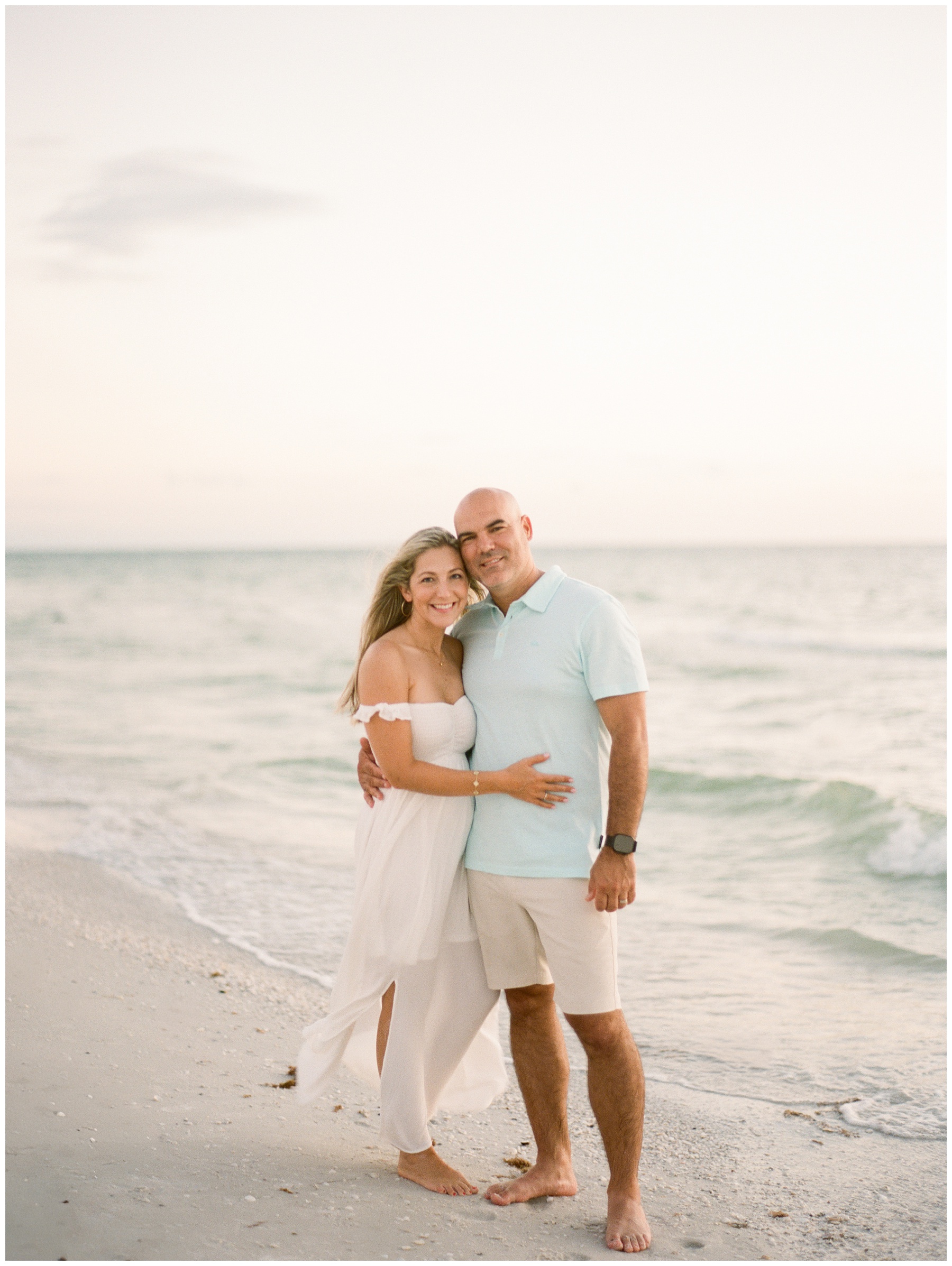 For beach sessions at the JW Marriott Marco Island, soft neutrals and coastal tones tend to photograph especially well against the sand and Gulf backdrop. Lightweight fabrics, natural textures, and simple silhouettes allow the focus to remain on connection rather than clothing.